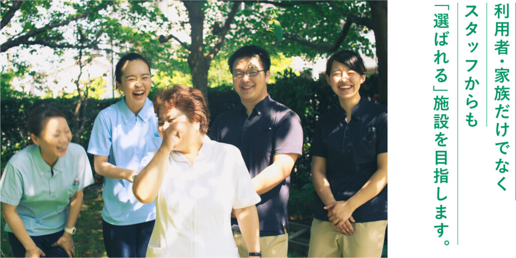サービスの基本となる接遇を中心とした職務評価制度を導入し、職員のホスピタリティ向上に力を入れています。働く環境が良くならなければ、質の高い介護は提供できないという理念のもと、スタッフ一人ひとりが高い意識をもって日々の業務に取り組んでいます。