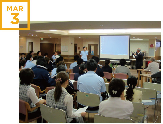 施設では教育委員会を中心に、毎月一回様々なテーマで施設内勉強会を実施しています。介護、医療、食事、接客、外部講師を招くこともあります。ここで得た知識を日々の業務で活かしています。また資格取得支援など個々のキャリアアップも積極的にサポートしています。